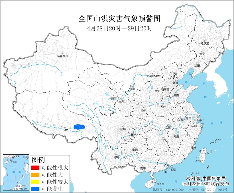 预计,4月28日20时至29日20时,西藏东部的部分地区可能发生山洪灾害(蓝色预警)。其他地区也可能因局地短历时强降水引发山洪灾害,请各地注意做好实时监测、防汛预警和转移避险等防范工作。